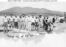 ![]() (L-R) Cdr. W.R. Specht, Admiral E.C. "Mike" Moran, and LCdr. R.B. Kelly at Rendova, May 1944 | |