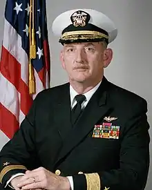Robert Lee Leuschner Jr. (March 13, 1935 – July 19, 2016) was a rear admiral in the United States Navy. He was Commander of the nuclear-powered carrier USS Enterprise from 1983 to 1986.[1][2] A native of Texas, he was born in Waco, and later moved with his family to San Diego, California, where he graduated from high school. In 1953, he was admitted to Rice Institute in Houston, where he enrolled in the chemical engineering curriculum. He also joined the Naval Reserve Officer Training Corps (NROTC), so that immediately after receiving his bachelor's degree, he was also commissioned as ensign in the U.S. Navy.