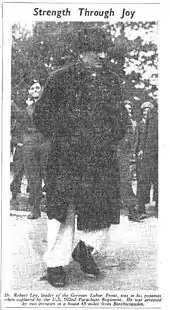 As head of the Labour Front, Ley invited Edward, Duke of Windsor, and Wallis, Duchess of Windsor, to conduct a tour of Germany in 1937, months after Edward had abdicated the British throne. Ley served as their host and their personal chaperone. During the visit, Ley's alcoholism was noticed, and at one point he crashed the Windsors' car into a gate.[11][12]