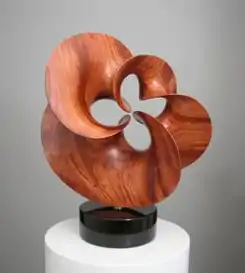 Although Longhurst's career began with figurative works, it soon evolved into non-representational abstraction in exotic woods, marble and granite that draws on his background in Architecture. Many of his pieces are defined as being at the intersection of where the fields of art and math overlap, and they have been discussed by Mathematicians such as Nathaniel Friedman, Reuben Hersh, and Ivars Peterson.[4][5][6][7] Some of his sculptures portray minimal surfaces, which were named after German geometer Alfred Enneper.[6] Nathaniel Friedman writes, "The surfaces [of Longhurst's sculptures] generally have appealing sections with negative curvature (saddle surfaces). This is a natural intuitive result of Longhurst's feeling for satisfying shape rather than a mathematically deduced result."[5]