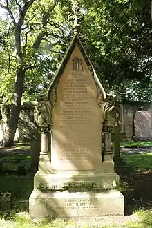 He died at home, 25 Abercromby Place in Edinburgh and is buried in the Dean Cemetery. His stone is fairly elaborate with angels on its shoulders and in a Gothic style very distant from his own style. He is buried with his children (three of whom died very young) and his wife Alexa Urquhart (1812-1897). It lies in the north-west section of the original section, just west of Sir Thomas Bouch's grave.
