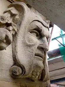 This is a Grade II listed building.[36] The foundation stone of St Paul's was laid on 3 November 1846 in Manningham, Bradford,[37][38] and the building was consecrated on 2 October 1848.[39] The architects were Mallinson and Healey.[37] When Mawer carved the label stops and corbels of the building in the form of heads, he and William Ingle were already "Mallinson and Healey's favourite stone masons". Mawer carved the original font and pulpit, however the pulpit was replaced in 1960 by one of oak, and the font has been painted in beige gloss.[40]