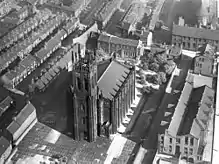 St Mary's was a large church designed by local architect Thomas Taylor with tower and clock on St Mary's street, Quarry Hill, Leeds. It was demolished in 1979.[56] The foundation stone of this "massive Gothic hall church with aisles as high as the nave"[56] was laid on 29 January 1823.[57] It was completed in 1826,[58] and consecrated on 12 October of the same year by the Archbishop of York[59][60] It cost £12,520 to build, using stone from Bramley and Horsforth quarries.[61][62] The Ripon and Leeds Diocesan Office is now on the site of the nave. Part of the graveyard remains.[63][64]