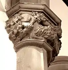 Over the inner doorway of the porch as we enter, the following text is carved on the face of the arch in the old church letter: "They that wait upon the Lord shall renew their strength." [In the chancel] the capitals are floreated and decorated with foliage interspersed with figures. The carving on the N. capital represents Sampson and Delilah, and on the S. David with the lion's jaw.[51]
