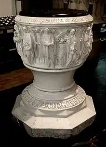 This is a Grade II listed building,[101] in Woodhouse, Leeds, West Yorkshire. It was designed by architects Peter Atkinson and Richard Hey Sharp in 1823,[102] consecrated on 13 January 1826,[103] and closed in 2001.[104] It was bought by Gateway Church in 2008, and reopened on 5 June 2014. Prior to and during the refurbishment many of the contents were removed including the pulpit, organ and most of the pews. The font is dismantled and in storage within the building.[105][106] Robert Mawer carved the font in 1853.[107] The Leeds Intelligencer described the font thus:[107]
