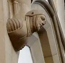 In 1954 the vicar obtained a faculty to destroy the reredos, and to remove the painted writing over the arches and along the south aisle wall, although that writing may still exist under the present paint.[82] Medieval carvings from the earlier church were installed in the vestry wall in 1852.[77][79] A chair from the old church is also in the vestry, and a chair and table from the earlier church are in the nave.[83] The 1861 west window made by Hughes of London and dedicated to Canon Robert Deaville Owen (1823−1904), features the Apostles James, Paul and Peter.[84][85][86]