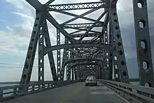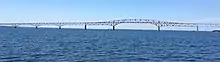 The Robert O. Norris Bridge is a truss bridge that spans the Rappahannock River in Virginia, United States and serves as the crossing for State Route 3 over the river between Grey's Point on the Middlesex County side and the town of White Stone in Lancaster County. The span was opened on August 30, 1957, and replaced a ferry service directly West of where the current bridge is located. Commonly known by locals as the White Stone Bridge or Rappahannock River Bridge, this span is a critical crossing between the Lower Middle Peninsula and the Northern Neck as the next closest crossing is over 30 miles (48 km) upstream near Tappahannock. Traffic forced to utilize a detour over the upstream crossing could potentially travel over 90 miles (140 km). The Norris Bridge is 11,237 feet (3,425 m) long,[1] and provides a Mean High Water clearance of 110 feet (34 m) under the center span with a channel depth of over 60 feet (18 m). The bridge is maintained by the Virginia Department of Transportation. When first opened, the bridge was crossed by just over 1,000 vehicles per day, on average. Tolls were removed from the bridge in 1976, and by 1978 the average daily traffic had risen to over 2,500 vehicles per day. By 2006, traffic counts reached 11,309 vehicles per day[2] but shrank to 6,900 Annual Average Daily Traffic in 2017.[3]