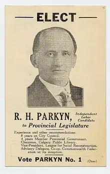 In the 1921 Alberta general election Robert ran his first provincial campaign as a Labor candidate and ended up finishing 8th in a field of 20 candidates. Parkyn was elected in the 1926 Alberta general election this time as an Independent Labor candidate (of labour but not directly tied to any labour group). He won the 5th seat in the Calgary district. The win was seen as an upset. He was defeated after serving a single term in office.