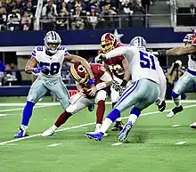 In week 4 against the New Orleans Saints, Quinn sacked Teddy Bridgewater twice in the 12-10 loss.[35] In week 6 against the New York Jets, Quinn sacked Sam Darnold twice in the 24-22 loss.[36] In week 7 against the Philadelphia Eagles, Quinn recorded a sack on Carson Wentz before leaving the game with a rib injury. Without Quinn, the Cowboys won 37-10.[37] He finished the season with 25 tackles, 11.5 sacks (led the team), 37 quarterback pressures, 3 passes defensed and 2 forced fumbles.