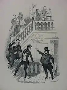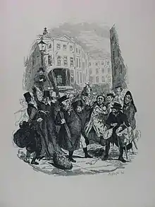 Seymour's suicide came after his struggle with mental illness and his breakdown in 1830. It is thought that Dickens had advertised for a new illustrator for The Pickwick Papers and it is clear that Seymour was struggling to design images in line with Dickens' requirements. "The Dying Clown" is harsh and emotional, a huge way from the funny and lighthearted illustrations which Seymour had envisioned for the series. Until English law changed in 1870 suicide could produce a verdict of felo de se (felon to self). This meant the person did not receive a religious burial and his family were denied any of his estate which would go to the Crown by default. Therefore, no attributed royalties could go to his widow Jane Seymour from his work per se.[1] The commission then passed to Robert William Buss, but, these being judged unsatisfactory, were then passed to Hablot Knight Browne known as Phiz[2] from issue four of the magazine until its completion in 1837. Phiz also completed illustrations for the book version as well.