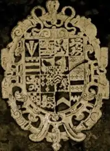 1. A pheon (Sydney) 2. Barry of ten a lion rampant crowned (Brandon) 3. A lion rampant double queued (Dudley) 4. Two lions passant (Somerie) 5. Barry of six in chief three torteaux a label of three points for difference (Grey, Viscount Lisle) 6. A maunch (Hastings) 7. A wolf's head erased (Lupus, Earl of Chester) 8. Barry of ten as many martlets in orle (de Valence, Earl of Pembroke) 9. A lion rampant (Marshall, Earl of Pembroke) 10. Seven mascles conjoined three and one (Ferrers of Groby) 11. A lion rampant within a bordure engrailed (Talbot) 12. A fess between six crosses crosslet (Beauchamp) 13. Checky, a chevron ermine (Newburgh, Earl of Warwick) 14. A lion statant gardant crowned (Baron de Lisle) 15. A chevron (Tyes) 16. A fess dancetty (West); over-all an inescutcheon of pretence of his wife's paternal arms: quarterly: 1. Five fusils in bend on a chief three escallops (Gamage) 2. Vair (Martel?) 3. Checky, a fess ermine (Turberville of Coity Castle) 4. Three chevrons (Llewellyn)