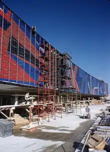 The American Airlines project was Sowers' most important commission. Completed in 1960, it was an iconic glass mural 317' long by 23' high covering the entire facade of the building designed by Kahn & Jacobs for what was then Idlewild Airport in Queens, New York - renamed after the Kennedy assassination to John F. Kennedy International Airport.[14] It was composed partially of a German opaque glass that was quite unusual, consisting of both transparent blues and reds on a solid white base. The design was also unusual in that it was seen in its entirety from the exterior as a form of mosaic.[15] Traditionally architectural stained glass was viewed, and therefore designed the other way around, from the inside looking out. Additionally, once inside the terminal it would never be experienced as a whole. Historically early church and cathedral stained glass walls read as dark surfaces, thus the need to utilize dense opaque glass. Additionally, the system was single glazed which meant that the colors were seen to maximum effect as travelers approached the terminal. The idea of developing a reversible image was picked up and pursued by the architect, Percival Goodman, whose projects included many Synagogues. He felt that as a number of services were conducted at nighttime any stained glass should work in some way under reverse conditions. Sowers completed several Synagogue projects for Goodman.