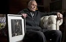 Robert Hyndman in 2009 with a photograph of himself during the Second World War. The wartime portrait is by Yousuf Karsh