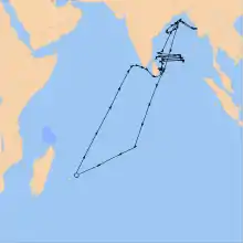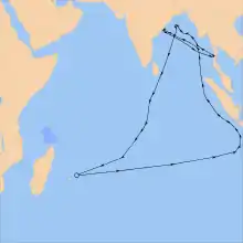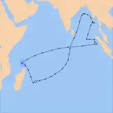 On 3 March 1789, he enlisted as a volunteer on the 700-ton Aurore,[6] under Captain Tardivet, a slave ship[1] bound for India.[4] Aurore sailed to Pondicherry and ferried troops[8] bound for Isle de France.[6] On her next journey, seeking to purchase slaves on the Horn of Africa, Aurore was wrecked in the Mozambique Channel, drowning 400 enslaved Africans chained in the orlop.[8] Tardivet chartered the Portuguese San Antoine in October 1790 to return to Port-Louis, but had to divert to Sumatra because of the weather, and only returned to Port-Louis in late 1790, on a French ship via the French colony of Pondicherry.[8] Promoted to officer, Surcouf enlisted on the Courrier d'Afrique, another slave ship,[1] bound for Mozambique under Captain Garnier.[6] Captain Tardivet then brought him over as Lieutenant on his new ship, Revanche.[9] On Revanche, Surcouf made several expeditions off Madagascar.[6][9]