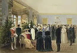 In 1868, after a visit to the Netherlands, he received a commission for work from Thomas Agnew & Sons, who showed a collection of his pictures in their galleries in 1869. One picture was purchased by Queen Victoria, and he was soon employed on many water-colour drawings of royal functions, from "Thanksgiving Day" in 1872 to Queen Victoria's funeral in 1901. He returned to the Netherlands, where he dined at Het Loo Palace with King Leopold II of Belgium and met the painter Jozef Israëls. In 1869 and 1871 he exhibited scenes of Scheveningen at the Royal Academy, and in the latter year he published Brush Notes in Holland and made numerous sketches in Paris after the Commune. After a visit to Norway in 1874–75 he published Gamle Norge (1878).[1]