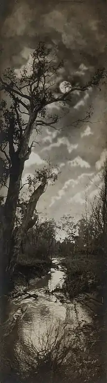 Scott was issuing panoramic postcards and in 1908, after a move to Western Australia, was invited to judge the Boulder Technical School Camera Club competition. He embraced the Pictorialist photography movement that was particularly advanced in Adelaide in these years due largely to its promotion by Adelaide-born art photographer John Kauffmann (1864-1942).[10][1] That Vere Scott was regarded as an equal to Kauffmann is seen by their equal billing and high profile in the Christmas number of the Adelaide newspaper The Observer.[11] Beyond the traditional topographical factuality of his city views, the influence of this style is evident in Scott's exposure, printing and retouching (usually in skies) for chiaroscuro effects in his views, some being made to look as if taken by moonlight.[12]