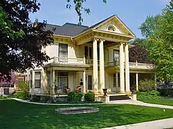 The Wagner home was designed in the Neoclassical style by Frederick G. Clausen of Davenport, Iowa and was built in 1904.[2] It features a three-bay front façade with a central entrance, a balcony, and a two-story portico. The pediment above the porch is supported by pairs of fluted Ionic columns. Bracketed eaves extend along the cornice below a deep overhang. Larger brackets support the entrance balcony. Galleries with turned spindles and urn-shaped finials flank the entrance. The gallery on the north is extended to form a porte cochere. On the north side of the home is a beveled and leaded stairway window. A two-story bay on the south side features a “bottle glass” window. On the interior, the grand staircase features a semi-circular balcony. Original mechanical devices in the home include a speaking tube, doorbell system and a corner light system.[2]