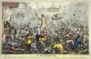 Wedderburn was sufficiently well known to be the subject of at least one satirical print by the caricaturist George Cruikshank, who in 1817 published "A Peep into The City of London Tavern" in which Wedderburn is caricatured alongside the social reformer Robert Owen.[12] The central figure in Cruikshank's 1819 print The New Union Club may also be a caricature of Wedderburn. [12]