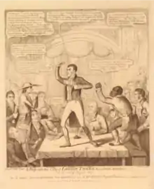 Politically influenced by Thomas Spence, Wedderburn was an impassioned speaker and became de facto leader of the Spencean Society in 1817 after the nominal leaders were arrested on suspicion of high treason.[2] Wedderburn published fiery periodicals advocating republican revolution, using violence if necessary, to bring about redistribution of property in Britain and the West Indies.[13] In 1824, he published an anti-slavery book entitled The Horrors of Slavery, printed by William Dugdale and possibly coauthored by George Cannon.[14]