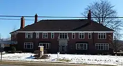 The Robert and Julia Darling House stands in the town center of Simsbury, on the east side of Hopmeadow Street, its principal thorough fare. It is just north of the Drake Hill shopping center, which stands on land formerly part of the Darling estate. It is a large two-story brick building, with a hip roof and a brownstone foundation. A two-story ell projects to the rear from its northeastern corner. The building exhibits basic symmetry in the Colonial Revival style, and has finely detailed entrances on the front-facing west, south, and in the corner created by the ell, which features a curved pavilion and porte-cochere. The interior, although it has been repurposed for office use, retains most of its original period woodwork.[2]