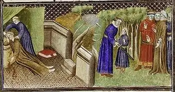 The oldest-known account of this legend is a Latin prose narrative by a Dominican friar, Etienne de Bourbon (c. 1250), in which no information on Robert's family is given. Then it appears in a French metrical romance of the 13th century, in which Robert is described as the son of the duchess of Normandy.[2] An English translation by Samuel N. Rosenberg of the 13th-century French romance was published in 2018 by Penn State University Press. It appears also in a "dit" of somewhat later date, and in a miracle play of the 14th century. A French prose version was also prefixed to the old Croniques de Normandie (probably of the 13th century). But the legend owes its popularity to the story-books, of which the earliest known appeared at Lyons in 1496, and again at Paris in 1497, under the title La Vie du terrible Robert le dyable.[3] Since the 16th century the legend was often printed together with that of Richard sans Peur (Richard I, Duke of Normandy); it was published in completely recast form in 1769 under the title Histoire de Robert le Diable, duc de Normandie, et de Richard Sans Peur, son fils.