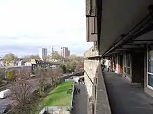 The flats themselves were a mixture of single-storey apartments and two-storey maisonettes, with two to six bedrooms. The maisonettes were designed with the bedrooms facing inwards shielding the residents from the traffic noise. Another design feature was the wide balconies (the "streets") on every third floor, the concept being to provide public space which would encourage interaction. Alcoves called "pause spaces" were provided next to the entrance doorways on the "streets" which the Smithsons hoped the residents would personalise and where children would play.[1] As with many other council housing blocks in the UK, tenures diversified somewhat and included social housing tenants, leaseholders who exercised the right to buy and subsequent private owners, and private tenants of leaseholders.[8]