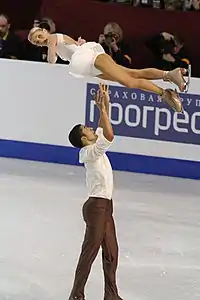 They attempted the throw triple Axel again in the short program at 2011 NHK Trophy but Savchenko took another hard fall.[42] They finished third at the event.[47] Savchenko/Szolkowy rebounded to win the 2011 Rostelecom Cup.[48] They qualified for the 2011–12 Grand Prix Final. Although they did not attempt it in Russia, they said they had not ruled out the triple Axel.[49] At the Grand Prix Final, Savchenko/Szolkowy won the gold medal with a total score of 212.26, defeating Volosozhar/Trankov by a margin of only 0.18 points.[50][51][52] Savchenko/Szolkowy missed their nationals with the German Skating Union's okay and continued to work on the throw triple Axel.[53]