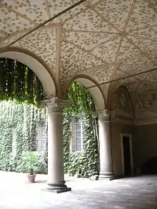 At the centre of the castle is a porticoed courtyard with Ionic columns. The vaults of the portico have Groteque-style frescoes. Four statues at each corner complete the decoration.