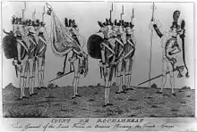 Cartoon anonymous American in 1780 on the Count de Rochambeau during a parade of French troops at Newport