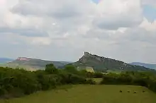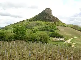 The Rock of Solutré (French: Roche de Solutré) is a limestone escarpment 8 km (5.0 mi) west of Mâcon, France, overlooking the commune of Solutré-Pouilly. It is an iconic site in the department of Saône-et-Loire, in Bourgogne-Franche-Comté. Protected by the French law on sites naturels classés and currently at the heart of a grand site national operation, it draws its fame severally as a rare geological phenomenon of the region, as a prehistoric site of the eponymous Solutrean paleolithic culture, and for the natural environment which its summit provides, the pelouse calciole grassland of Mâcon, with its distinctive flora and fauna. Occupied by humans for at least 55,000 years, it is also the cradle of the Pouilly-Fuissé wine appellation. It has attracted media coverage since the 1980s when French President François Mitterrand started to make ritual ascents of the peak once per year.