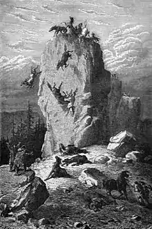 Contrary to the legend of the "hunt into the abyss", prehistoric man of Solutré region never hunted horses by driving them off the rock. This theory, which was never brought by Testot-Ferry, in his scientific publications, in fact appeared in Arcelin's prehistory-based novel, "Solutré" (Paris 1872); it has never been other than a fiction which caught the popular imagination. The incongruity of this hypothesis was easily shown from the distance between the bones and the summit of the rock, among other considerations.