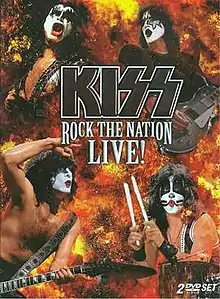KISS: Rock the Nation Live! is a 2005 live music DVD by American hard rock band Kiss. The DVD is notable for the addition of "Kiss Powervision", which enables the viewer to select different camera angles, each focusing on a different member of the band. The DVD is a compilation of footage from two concerts, performed in Washington, DC, and Virginia Beach, VA, on July 24 and 25, 2004.