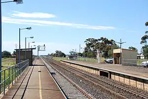In 1960, the crossing loop was extended for longer trains of up to 730 metres, and a short platform was provided on the loop road. In 1976, Centralised Traffic Control was provided on the line from Sunshine to Rockbank. By the 1970s, the mill was disused, and the station building was demolished circa 1985. In 1986, the yard was rationalised to a main line and crossing loop and, in 1990, the mechanical signals and points were removed, and replaced by remotely controlled signalling, operated from the Bacchus Marsh signal box. The current northern platform (was Platform 2, now Platform 1) was not provided until 1992,[4] replacing the former short platform. As part of the Regional Fast Rail project, control of the signals was transferred to the Ballarat signal box in 2005.[2]