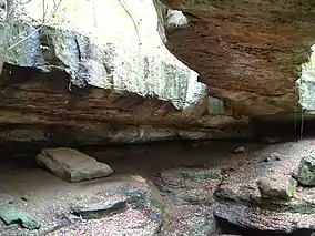 The natural bridge is the largest of at least 12 natural bridges in the state of Ohio. It is approximately 100 feet (30 m) long, 10 to 20 feet (3.0 to 6.1 m) wide, and 3 feet (0.91 m) thick. It was formed when water eroded the softer layers of Mississippian Black Hand sandstone underneath the bridge.[1][3] The nearby community of Rockbridge, Ohio is named after the formation.