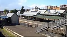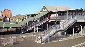 In 1920 a steel footbridge from the Maitland District was re-erected, followed in 1922 by the timber overhead booking office. In 1923 quadruplication of the line was undertaken, and new platforms added for the quadruplication. The original signal box was built on the north end of Platform 2-3 but in 1923 was replaced by the present (disused) brick elevated box on the western side of the line, east of the T junction of Railway Street and Oakura Street. Also in 1923 a new Platform No. 1 with brick waiting shed was built along with another siding, both having "dead-end" sidings for carriage storage. In 1926 the lines were electrified, and the tramway link was disconnected in 1938.[2]