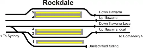 Rockdale Railway Station is located between Railway Street on the west and Geeves Avenue on the east and is accessed from both streets via a footbridge, stairs and modern lifts. The station has three island platforms. Along both Railway Street and Geeves Avenue adjacent to the station are extensive bus shelters. Adjacent and to the south of the western entry to the station (off Railway Street) is a distinctive 2-storey brick Inter-War Functionalist style retail building.[2]