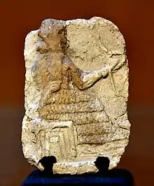 The Rod and ring symbol is a symbol that is depicted on Mesopotamian stelas, cylinder seals and reliefs. It is held by a god or goddess and in most cases is being offered to a king who is standing, often making a sacrifice, or otherwise showing respect. The symbol dates from the Ur III period to the Neo-Assyrian period, and is commonly explained as a coil of measuring string and a yardstick.[1] Other theories are that they are a shepherd's crook and a nose rope,[2] or that the ring is no rope at all.[3]