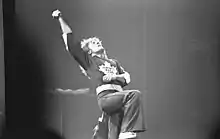 The band's second single, "Anyway, Anyhow, Anywhere", was a collaboration between Daltrey and Townshend.[20] As Townshend developed into one of rock's most accomplished composers, Daltrey gained a reputation as a singer and front-man. The Who's stage act was energetic, and Daltrey's habit of swinging the microphone around by its cord on stage became his signature move. Daltrey's Townshend-inspired stuttering expression of youthful anger, frustration, and arrogance in the band's breakthrough single, "My Generation", captured the revolutionary feeling of the 1960s for many young people around the world and became the band's trademark. Later, his scream near the end of "Won't Get Fooled Again" became a defining moment in rock and roll.[21]