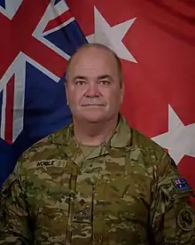 Noble was seconded to the United States Army in 2016 and deployed with the 101st Airborne Division as Deputy Coalition Land Force Commander, Iraq, as part of Operation Inherent Resolve.[2][12] In this post, Noble was subordinate to Major General Gary J. Volesky and effectively second-in-command of Coalition forces supporting the Iraqi Army in the war against the Islamic State. In an interview with ABC News, Noble expressed confidence that the war against the Islamic State was being won but, remarking on the conduct of warfare in Iraq, conceded that "it's complicated" and that there was "a lot of conventional direct ground combat with high casualties and high risk".[12] He was promoted major general in November 2016 and,[13] the following March, succeeded fellow Australian, Major General Greg Bilton, as Deputy Commanding General – North of the United States Army Pacific in Hawaii.[14] After almost two years, Noble relinquished the command to Major General Daniel McDaniel in January 2019.[15] He was subsequently appointed Deputy Chief of Joint Operations in Headquarters Joint Operations Command. Noble swapped positions with Rear Admiral Jaimie Hatcher in September 2019, becoming Head Military Strategic Commitments within the Vice Chief of Defence Force Group.[16] In this role Noble is responsible for the strategic management of potential and present commitments for the Australian Defence Force.[17]