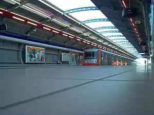 Rojas Magallanes is an elevated metro station on the Line 4 of the Santiago Metro, in Santiago, Chile. The station has two side platforms and two tracks on a precast concrete segmental viaduct[2] with single central columns. It is enclosed in a tubular structure with elliptical cross section, from which protrude two balcony-like structures containing stairs that lead to the mezzanine level.