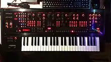 The Roland JD-XA is a hybrid analog and digital synthesizer that was released in 2015, it is Roland's first analog polyphonic synthesizer since 1986.[1] The instrument is encased by a shiny black front panel covered with knobs and sliders reminiscent of the Roland JD-800.[2] The JD-XA comprises a 4 voice analog engine and a 64 voice digital engine, which can be used interactively or independently, thus providing a flexible platform for sound design.[3]