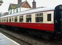 | SECR | 971 | Hundred Seater | Built in 1923. Withdrawn from traffic in 2007 for what was hoped to be a quick overhaul. Examination revealed a much heavier amount of work was required on the carriage's side panels and underframe, as well as a need to replace rotted sections of the roof and internal partitions, as well as re-trimming of the seats. The carriage is currently in store awaiting restoration. | ![]() |