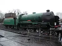 | SR | 2-6-0 | Maunsell U Class | Maunsell Locomotive Society[10] | No. 1618. Built in 1928. Arrived at Bluebell 1977 from the Kent & East Sussex Railway. Last worked in 1994 and is on static display awaiting a 10-year overhaul. Its tender was loaned to the Watercress Line in 2010 as a replacement for classmate 31806's, which was heavily damaged in a fire at Ropley. The tender was returned to the Bluebell in mid-2011, 31806's having been repaired. 31618 has been painted in lined BR black to match the tender, and to smarten the appearance of the engine up after many years in the shed. The overhaul is not likely to start until the work has completed on others. Its overhaul requires boiler work, including firebox and re-profiled tyres. | ![]() |