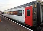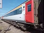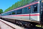 Dual braked, dual heated, private owner.[48] The Restaurant Miniature Buffet is a Tourist Standard Open (TSO) coach with two full seating bays next to the centre transverse vestibule removed and replaced with a buffet counter and customers standing space, and one bay on one side (same side as the buffet counter) removed and replaced with a store cupboard on the other side of the centre vestibule. | ![]() | |