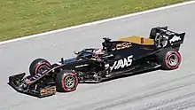 Haas retained Grosjean for the 2018 season where he again partnered Magnussen.[56][57] At the Azerbaijan Grand Prix, Grosjean crashed behind the safety car whilst running in 6th place. His engineer incorrectly blamed the cause of the crash on Sauber driver Marcus Ericsson, saying, "I think Ericsson hit us."[58][59] At the Spanish Grand Prix, Grosjean was the cause of a crash on the opening lap. Whilst making his way through turn 3, he lost control of his Haas after running through dirty air. This caused him to spin across the track into the path of the cars behind him, causing a large amount of smoke in the process. He was then hit by Hülkenberg and Gasly, eliminating all three from the race. In the Austrian Grand Prix, Grosjean finished 4th, his best result in his career at Haas, and his first points finish in 2018. Grosjean was disqualified from the Italian Grand Prix after the floor of his car was found to be illegal, taking away a 6th-place finish; although the team appealed this, the decision was upheld.[60][61] Grosjean finished the season 14th with 37 points.