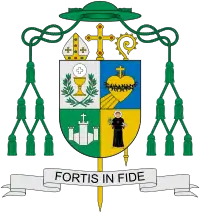 These arms show in the chief a star for Saint Nicholas of Tolentiono, the patron saint of the diocese. The three golden balls are Spanish doubloons and refer to the richness of the area, as there have been some gold mines in the diocese. Thebase shows a fishing boat, referring to the main source of income for the area.