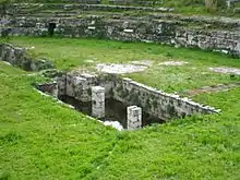 There were two entrances and a complicated system of steps which led from the upper levels to the exterior. At the centre of the arena there was a rectangular pit, which was originally covered. An underground passage ran from this pit to the entrance at the southern end of the amphitheatre. This pit and passage were necessary for machinery used during the shows. The seating in the cavea is separated from the arena itself by a high platform, under which was a vaulted corridor through which gladiators entered the arena. Above this were the front seats, which were reserved for high ranking individuals. The inscriptions carved on the blocks of the railing were edited by Gentili and seem to have been intended to indicate the different seating areas.[3][1]