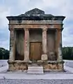 Above the entablature are placed two pediments, one at the front, badly damaged, but still retains the inscription, thanks to that has been identified in the building. The second pediment, in the back, is smooth and better preserved.