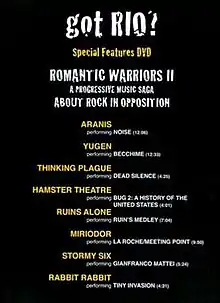 Got RIO? Romantic Warriors II: Special Features DVD is a 2013 documentary film and an addendum to the 2012 feature-length documentary Romantic Warriors II: A Progressive Music Saga About Rock in Opposition. The film was written and directed by Adele Schmidt and José Zegarra Holder, and was released in the United States by Zeitgeist Media.[1] It was generally well received by critics, with a reviewer at AllMusic saying that it "is a showcase for tremendous musicianship and a must-have for existing [Rock in Opposition] fans".[2]
