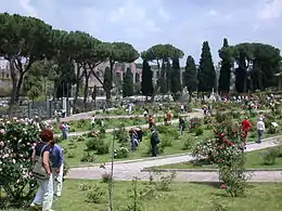 Rome Rose Garden is a public garden in Rome, Italy, located opposite the Circus Maximus on the Aventine Hill. The park was established in 1931. Over 1100 varieties of roses are grown there, many of them gifts from countries around the world. The Rome Rose Garden covers 10,000 m square and each section has rose varieties characteristic of, or grown in, the respective variety. The park also has an experimental section where new varieties of roses are tested for their suitability for public and private gardens in Italy.